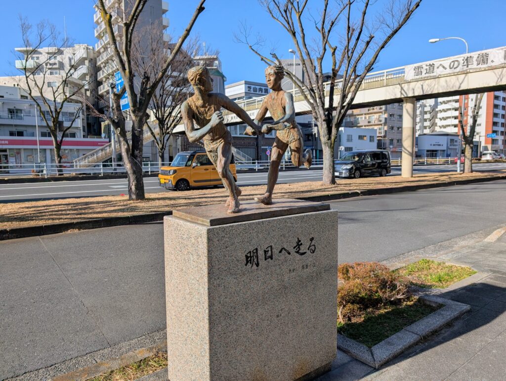 往路の歩道脇に建つ銅像「明日へ走る」は横浜市出身の彫刻家・堀内治雄の作品です。